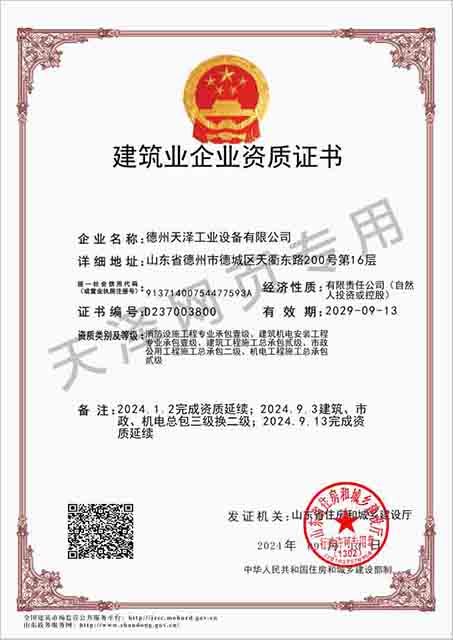 德州天澤工業設備有限公司成立于2003年(前身為德州天元集團天明工業設備安裝公司),經過20多年的發展,現成長為擁有職工600余人,各類專業技術人員近300余人,年生產能力兩億元以上,以建筑機電安裝工程、消防設施安裝工程施工為主,集建筑工程施工、市政工程施工、建筑智能化工程施工、園林綠化工程施工、工程管理服務、物業管理、電氣機械設備銷售等多元化經營于一體的綜合型企業。2005年,企業按照國際標準建立的質量管理體系,通過了ISO質量管理體系認證、環境管理體系認證、職業健康安全管理體系認證。施工工程遍布山東、河北、四川、江蘇等地,最具代表性的工程有:山東省德州市百腦匯資訊廣場機電安裝工程、德州經濟開發區天元大廈機電安裝工程、陵城區人民醫院機電安裝工程、德州金魯班大廈機電安裝工程、河北故城金辰小區機電安裝工程、北川地震災后援建工程等。多年來,公司始終堅持“以人為本,建精品工程,創行業品牌”的經營理念,先后榮獲省(市)級泰山杯、天府杯、魯安杯等獎項,申報各種功法、多項專利。